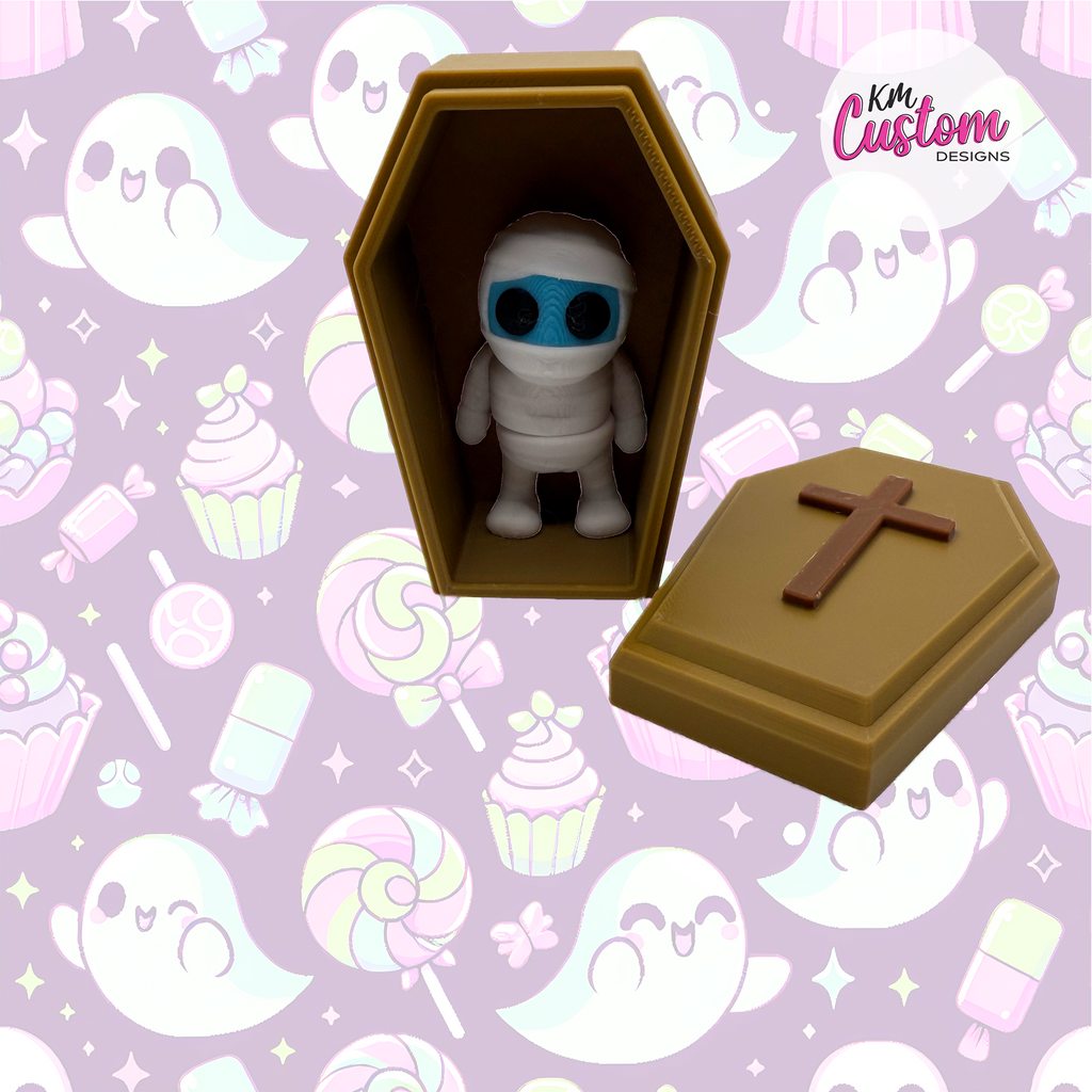 Coffin container measures 9cm x 5cm x 5cm. It fits 1 fidget.